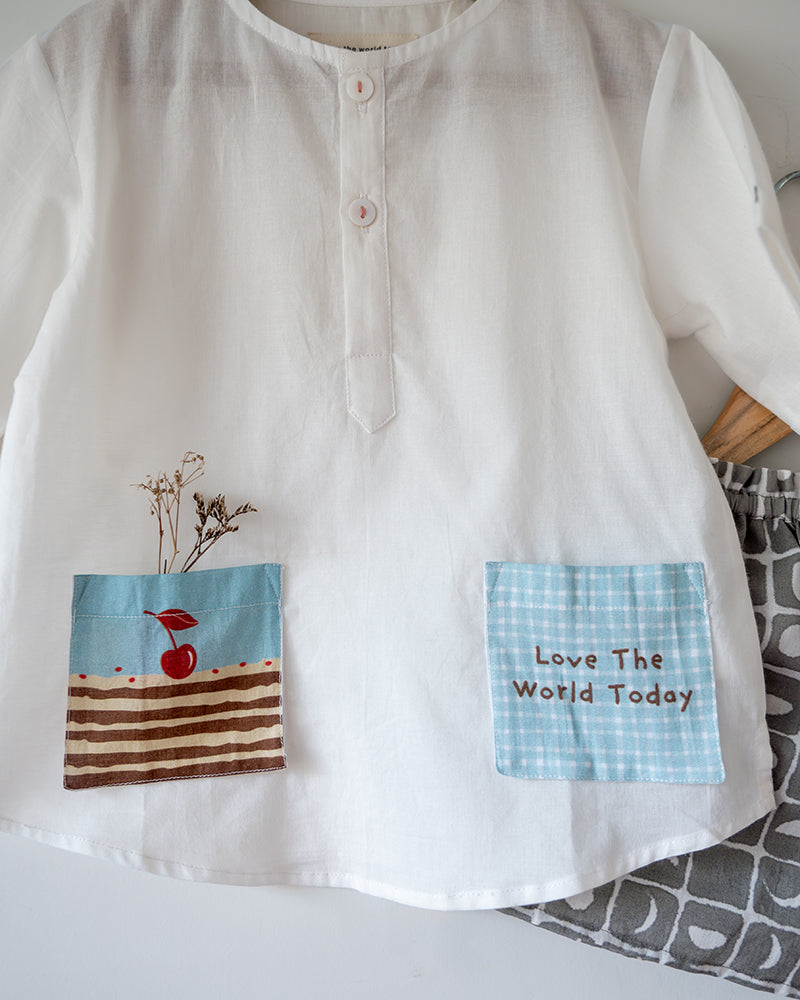 This kurta brings that quiet joy to life through thoughtful design. Crafted in soft, breathable organic cotton, it features a playful pocket printed with a slice of cake, adding a quiet hint of sweetness to an otherwise timeless silhouette.